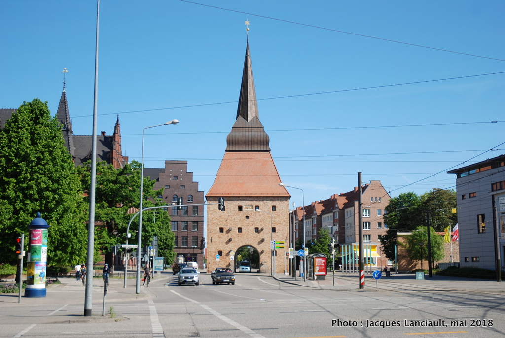 Il s’agit de la porte Steintor. Elle a été construite initialement en 1279. La porte, à l’époque de style gothique, était l’une des quatre portes principales de Rostock, avec celle de Kröpeliner, de Petri et de Mill.